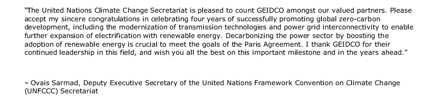 我们非常高兴全球能源互联网发展合作组织成为联合国气候变化框架公约秘书处重要的合作伙伴。我对合作组织过去四年在成功推动全球零碳发展、输电技术现代化、电网互联互通、可再生能源和电气化等领域所取得成就表示衷心祝贺!通过促进可再生能源发展以实现电力行业的减排,对落实《巴黎协定》减排目标至关重要。我感谢合作组织在这一领域持续的引领,并祝愿合作组织在这一重要里程碑后不断实现新的飞跃。