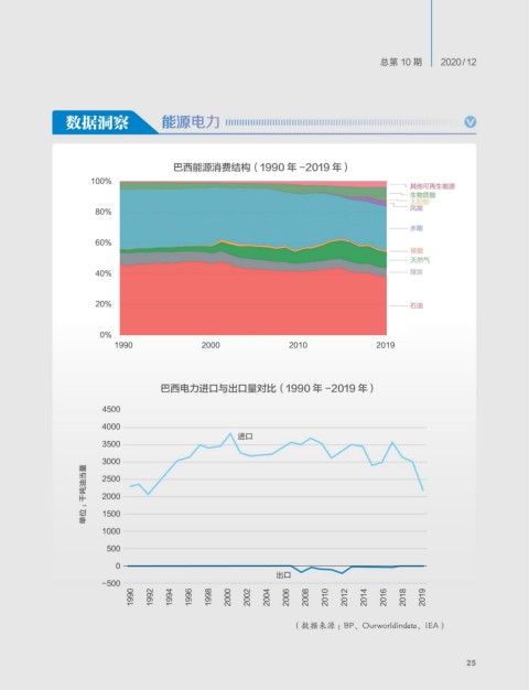巴西电力进口与出口量对比(1990 年 -2019 年)