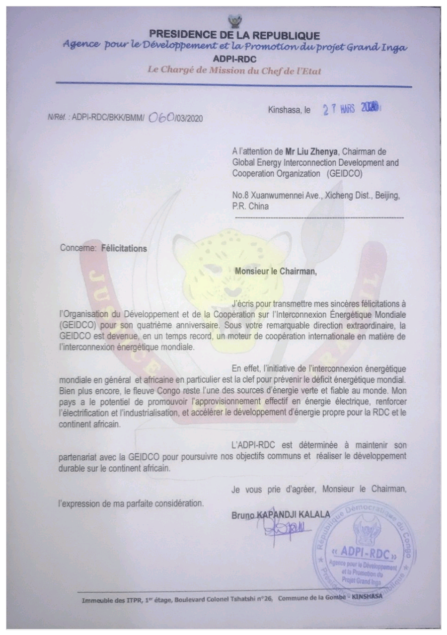 我谨在此向全球能源互联网发展合作组织(以下简称“合作组织”)成立四周年致以诚挚的祝贺。在您卓越的领导下,在短短四年时间里,合作组织已成为全球能源互联互通方面重要的国际合作引擎。