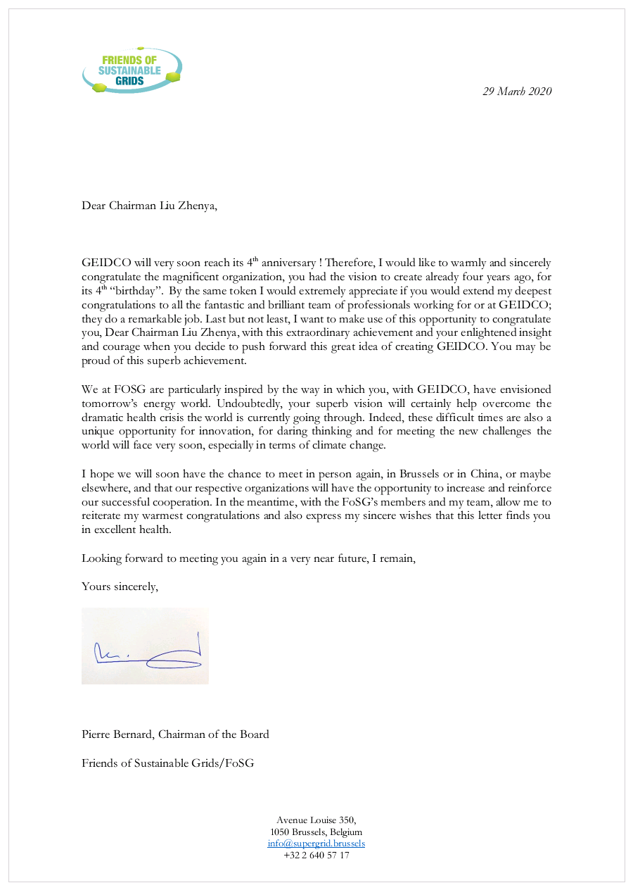 我希望能很快有机会在布鲁塞尔、中国或其他地方与您会面,以深化加深和增强双方合作。最后,请允许我代表超级电网伙伴组织的所有成员及我的团队,再次对您表示最热烈的祝贺,并衷心祝愿您身体健康。