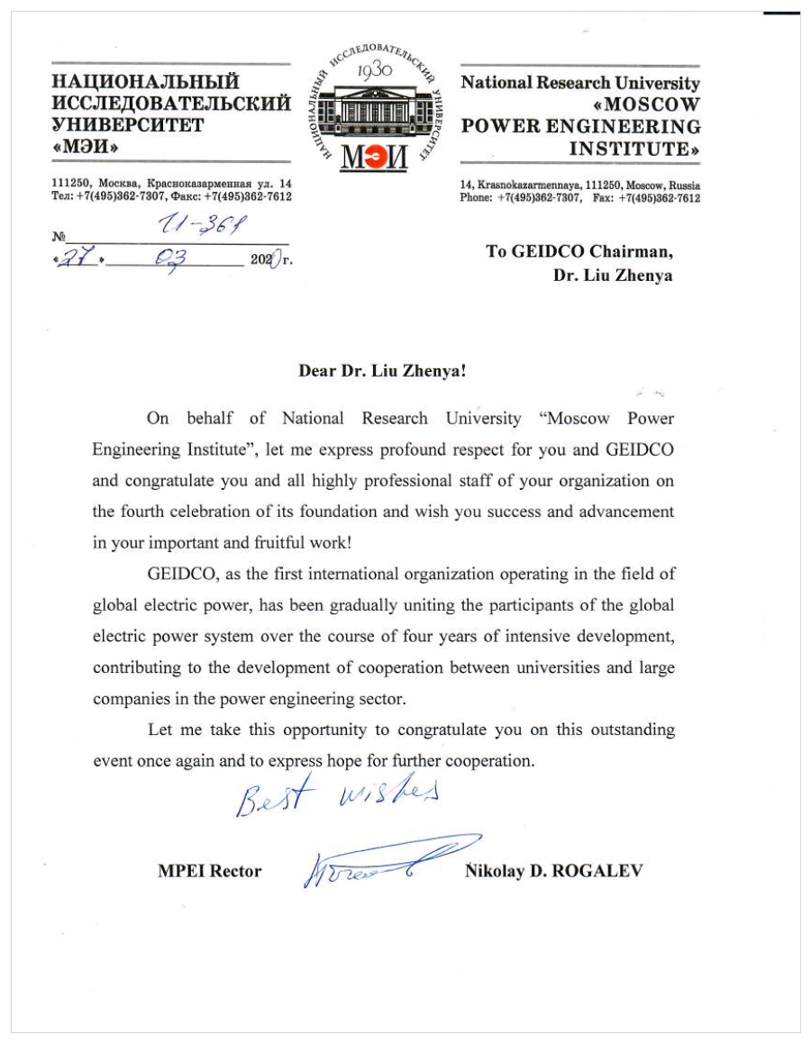 请允许我谨代表莫斯科动力学院国立研究大学向您,及全球能源互联网发展合作组织致以崇高敬意!在全球能源互联网发展合作组织成立四周年之际,向您并合作组织全体高素质工作人员表示祝贺,祝愿您在富有成效的工作中取得更加辉煌的成就!