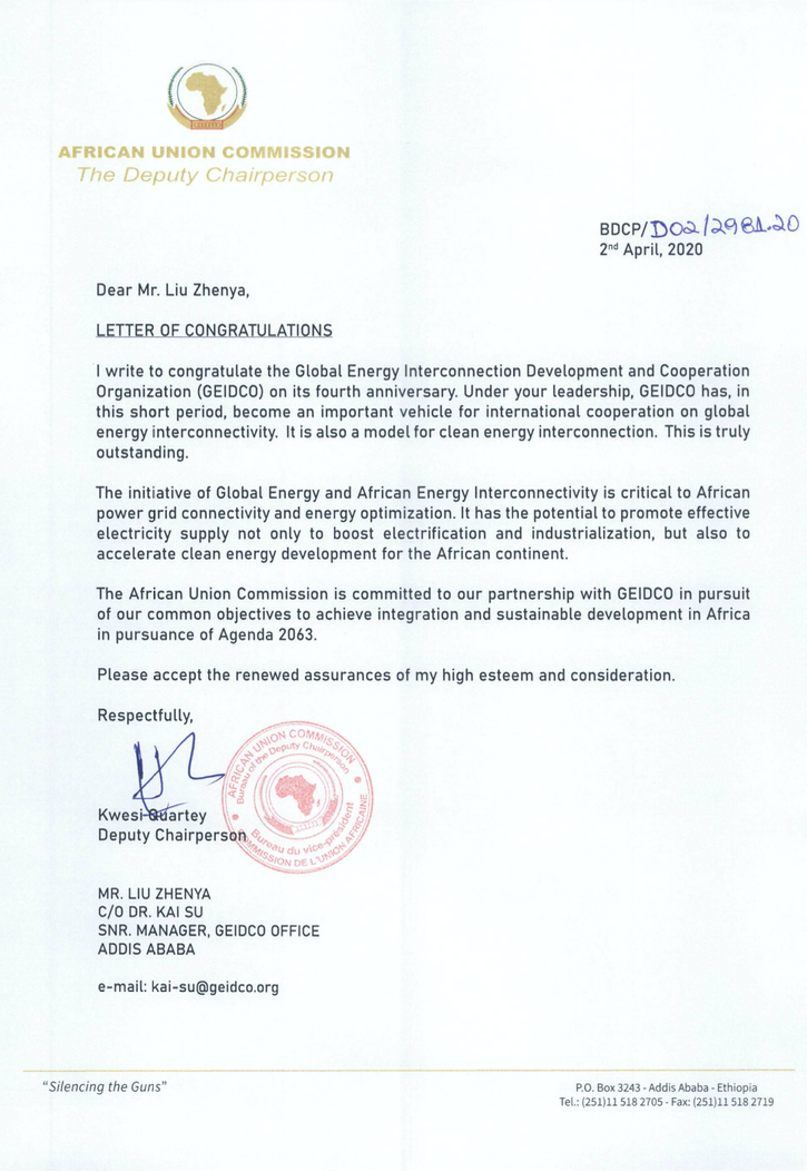 非盟委员会将一如既往地与全球能源互联网发展合作组织开展合作,共同追求非洲一体化与可持续发展,推动实现《非盟2063》目标。