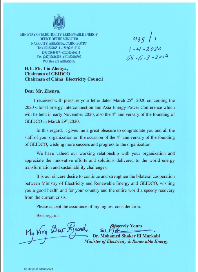 埃及电力部始终重视与合作组织的工作关系,赞赏合作组织为应对世界能源转型和可持续发展所做出的创新努力,希望合作组织与埃及电力部继续加强合作。我衷心祝愿您平安健康,期待中国人民和世界人民早日取得抗击新冠疫情的完全胜利。