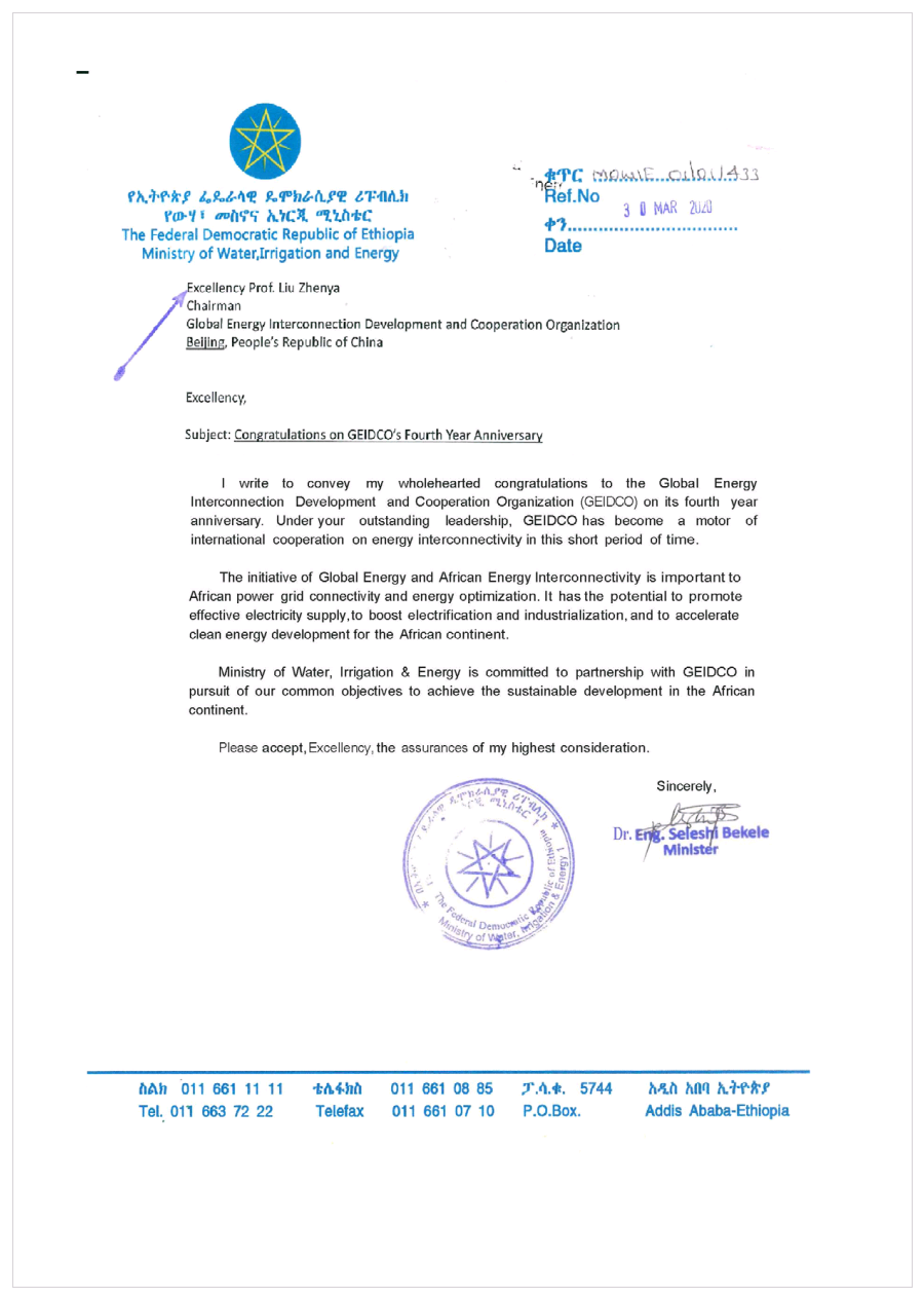 我谨在此向全球能源互联网发展合作组织(以下简称“合作组织”)成立四周年致以衷心的祝贺。在您卓越的领导下,合作组织在短短四年内,已成为国际能源互联互通领域的重要合作动力。
